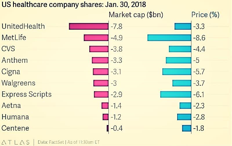 By the end of the day, it was clear that much of the drop came from a handful of U.S.-based healthcare companies, whose stocks had been unloaded by spooked traders. Why? There had been an announcement by Jeff Bezos of Amazon, Warren Buffet of Berkshire Hathaway and Jamie Dimon of JPMorgan Chase, Inc. that they were thinking about forming a new independent healthcare provider. The chart shows how the market prices of these companies fell as a result of this new, still-hypothetical competition. What it doesn't show is that these companies, collectively, saw their total worth-measured by the value of shares outstanding-drop $30 billion in roughly two hours of trading.